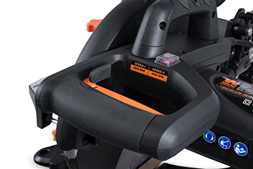 The WEN 70730 is a quality compound miter saw with a 10″ blade. It has two speed operations that go from 2000 rpm to 4500 rpm with the flick of a switch. The Smart Power Technology in its motor automatically adjusts torque for consistent RPMs through materials of varying density, such as board full of nails or a knotted wood.